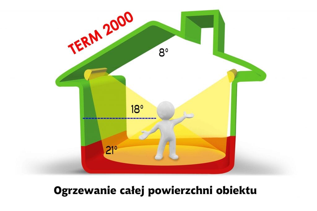 W uwarunkowaniach XXI w ogrzewanie „całych” budynków i hal jest błędem i prowadzi do rozrzutności energii i wysokich kosztów. Współczesne rozwiązania tego problemu idą w kierunku przekazania ciepła do odbiorcy w analogiczny sposób jak ma to miejsce w reflektorach oświetleniowych, w których wypromieniowana energia jest skupiona i ukierunkowana na wybraną powierzchnię padania. W takiej transmisji energii powietrze nie bierze udziału. Właśnie taki sposób przekazywania energii cieplnej ma miejsce w promiennikach ciepła TERM2000®. W porównaniu do ogrzewania konwekcyjnego promiennikowe ogrzewanie obiektów przemysłowych promiennikami ciepłaTERM2000® pozwala zapewnić pracownikom wymagany komfort termiczny przy niższej temperaturze powietrza w obiekcie o ok. 4-5°C. W konsekwencji zużycie energii cieplnej na uzyskanie podobnego efektu (poziomu odczucia ciepła) jest niższe o 25-30% w odniesieniu do systemów konwekcyjnych. Dodając do tego ograniczenie o 20-30% faktycznie ogrzewanej powierzchni hali – przy ogrzewaniu strefowym lub ogrzewaniu stanowiskowym – oraz skrócenie dobowego cyklu ogrzewania rzeczywiste zmniejszenie kosztów eksploatacji systemu ogrzewania przy zastosowaniu promienników podczerwieni może osiągnąć poziom 40-50%.