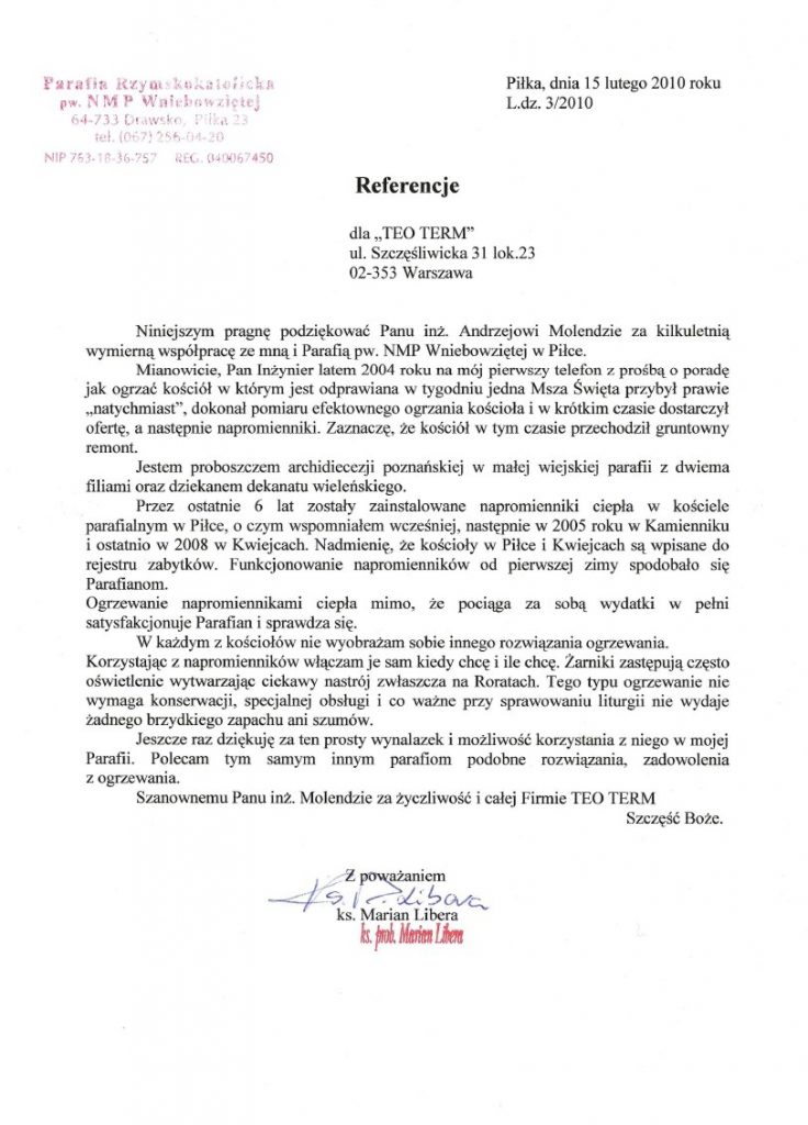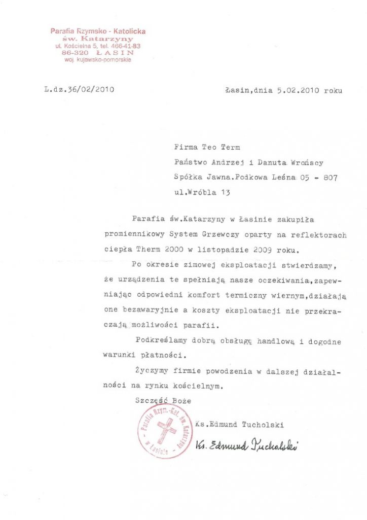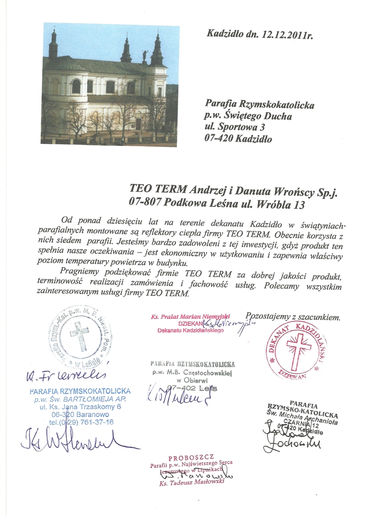 Krótkofalowe promienniki ciepła TERM2000® zaprojektowane zostały w 2000 roku z myślą o odbiorcach kościelnych. W procesie projektowania szczególny nacisk położono na estetykę, która w połączeniu z wyjątkową dbałością, o jakość produktu pozwoliła zdobyć uznanie konsumentów i wypromować urządzenia nie tylko na rynku kościelnym, ale także wśród odbiorców indywidualnych. Dzięki temu firma TEO TERM, należy dziś do wiodących, europejskich producentów elektrycznych promienników kwarcowo-halogenowych a ogrzewanie kościołów stanowi dla nas główny cel. Nasze reflektory ciepła TERM2000® ogrzewają ludzi w najdalszych zakątkach świata i stały się wyznacznikiem standardów.  W  Europie zaliczane są do produktów z tzw. „wyższej półki”. Dzięki stosowaniu najwyższych norm jakościowych w produkcji, promienniki TERM 2000® objęte są pełną –  6-cio letnią gwarancją. Dbałość w zakresie, jakości produktów i obsługi zaowocowały tym, że w okresie 18 lat zostały one zamontowane w 710 obiektach sakralnych różnych wyznań w kraju i zagranicą. Poza walorami estetycznymi ważnym argumentem decydującym o wyborze promienników ciepła TERM2000® do ogrzewania kościołów jest ich wysoka skuteczność i ekonomika w ogrzewaniu ludzi i obiektów. Koszty ich zakupu, montażu i eksploatacji są z reguły znacznie niższe od kosztów innych systemów ogrzewania stosowanych w obiektach sakralnych. Ważną informacją dla księży administrujących obiekty zabytkowe jest to, iż po przeprowadzeniu badań w ramach programu UE „Friendly Heating” wykazano nieszkodliwość elektrycznego systemu promiennikowego na zabytkową substancję kościoła. Dzięki tej opinii promienniki TERM 2000 są aprobowane i zalecane przez konserwatorów zabytków. Ogrzewanie kościołów tym sposobem przynosi jedynie korzyści dla Parafii.