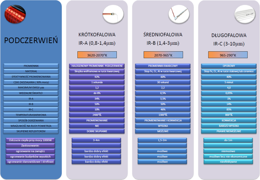 Poniżej prezentujemy podstawowe dane dotyczące podczerwieni oraz różnice pomiędzy trzema zakresami promieniowania cieplnego. W podanych danych wyrażnie widać jak oferowane systemy różnią się miedzy sobą w intensywności promieniowania cieplnego.