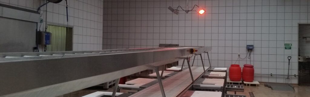 Przykład ogrzewania stanowiskowego w hali produkcyjnej, w tym przypadku inwestor zlecił zaprojektowanie i wykonanie systemu grzewczego który miał za zadanie dogrzewać pracowników na stanowisku pracy. Ze względu na rygorystyczne wymogi co do higieny zastosowaliśmy tu promiennik IP67 który w łatwy sposób można czyścić przy użyciu strumienia wody i detergentów.